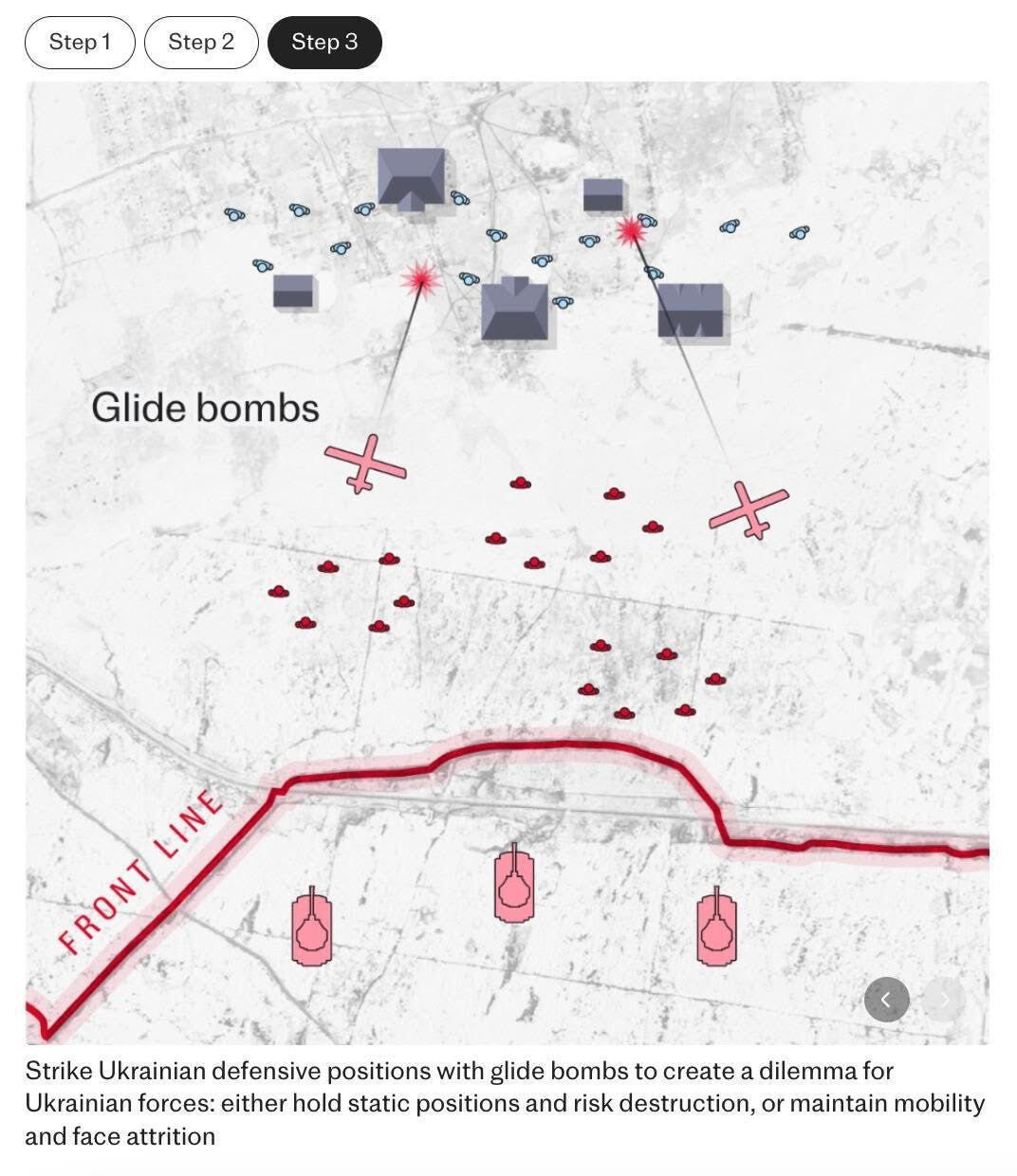 Larger assault platoons then follow, breaking into smaller teams tasked with seizing specific positions—homes, trenches, or wooded areas. This tiered approach is not about overwhelming force but about constant attrition and testing of Ukrainian lines. If positions are heavily defended, Russia implements a three-phase attack: first, small infantry groups pin defenders down; second, drones restrict movement and relay target data; third, glide bombs strike fixed positions.