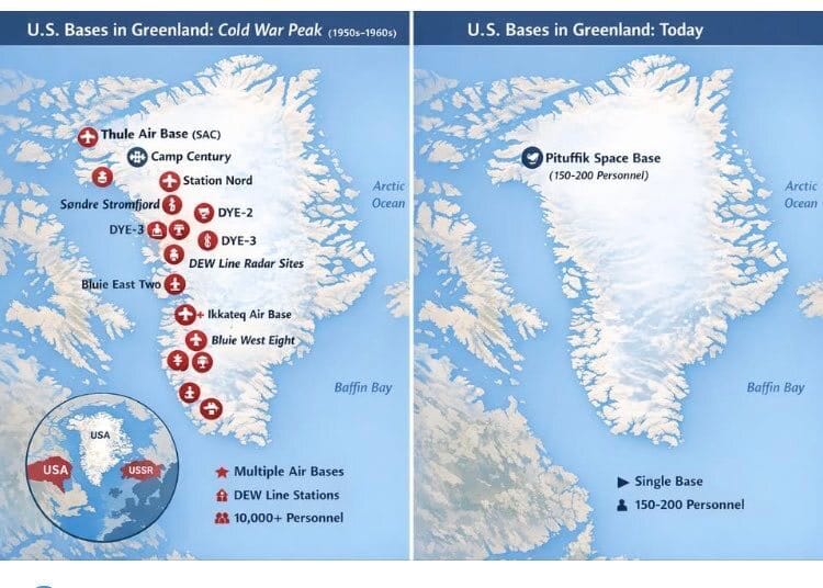 Beyond current facilities, the island still hosts a legacy network of Cold War–era airfields, radar stations, and logistics sites. While dormant, many remain geographically valuable and could be reactivated or adapted far more cheaply than building entirely new infrastructure elsewhere in the Arctic. Nonetheless, there would be costs in operating the bases, supplying them and upgrading them.