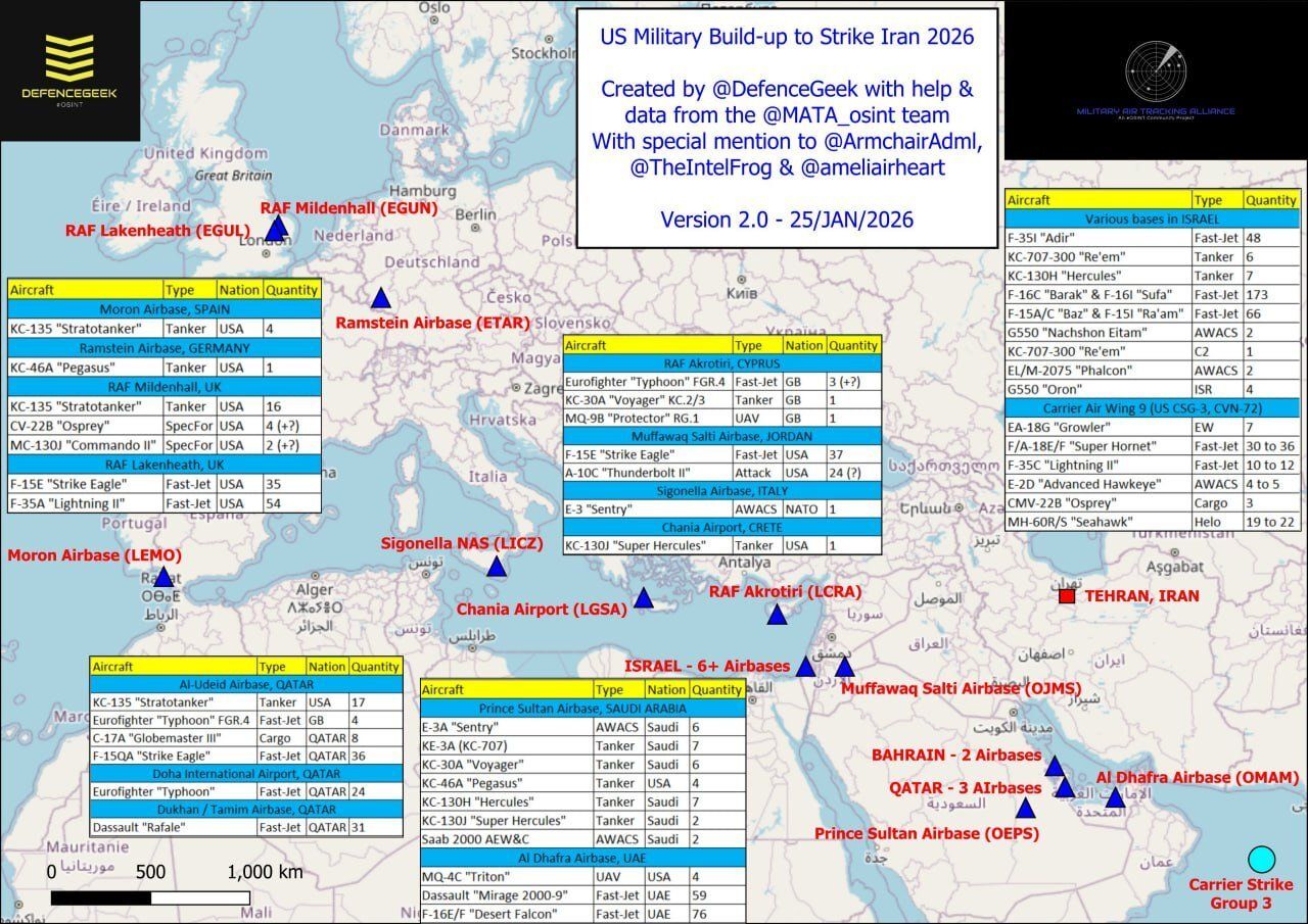 The presence of stealth and heavy strike fighters (F-35, F-15E, F-16, Typhoon, Rafale) suggests the ability to conduct precision strikes, escort missions, and defensive counter-air simultaneously. Transports (C-17, C-130) indicate sustained logistics, base reinforcement, and missile-defence support rather than a symbolic show of force. Carrier air wings add an independent strike option less reliant on regional basing.