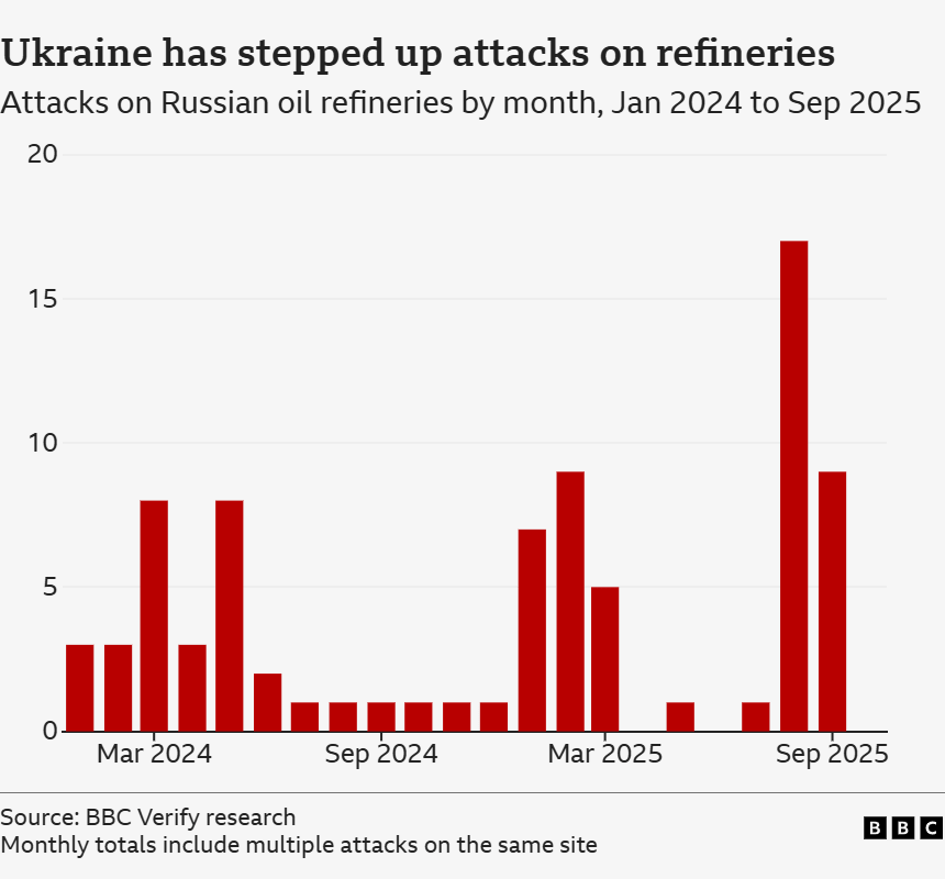 The key difference is that U.S. intelligence will now reach beyond the frontlines and into the heart of Russian territory. But this raises the question: how likely is it that Ukraine’s allies haven’t already been quietly assisting with such deep strikes, just without officially acknowledging it? Ukraine has sharply escalated drone strikes on Russian oil refineries in recent months, causing fuel shortages and price hikes in parts of Russia. BBC analysis shows 21 of Russia’s 38 major refineries have been hit since January, with successful attacks already 48% higher than in all of 2024. Many commentators suggest this new intelligence sharing will primarily focus on Russian energy infrastructure – yet based off the statistics they clearly already have it or don’t need it.