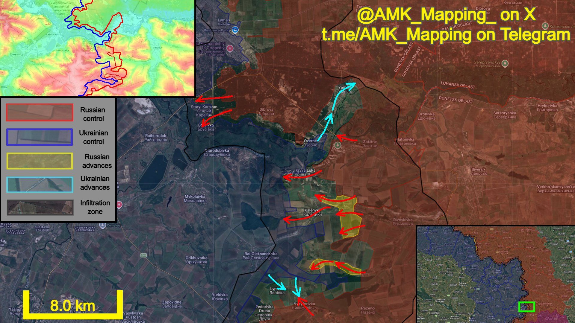 Russian and Ukrainian forces are conducting simultaneous offensives across the Lyman and Rai-Oleksandrivka axes, with Russian troops making incremental gains. In the southeast, Russian units advanced through forested areas near Pazeno and east of Rai-Oleksandrivka, while Ukraine counterattacked around Nykoforivka and re-entered Lypivka. To the north, Russian forces cleared positions near Riznykivka and pushed toward Kalenyky, expanding control of nearby treelines. Fighting has intensified around Kryva Luka, with a growing grey zone, as Ukrainian troops advanced into central Yampil. Additional Russian infiltrations were reported near Zakitne and south of Lyman, including limited advances into Brusivka and surrounding forest areas.