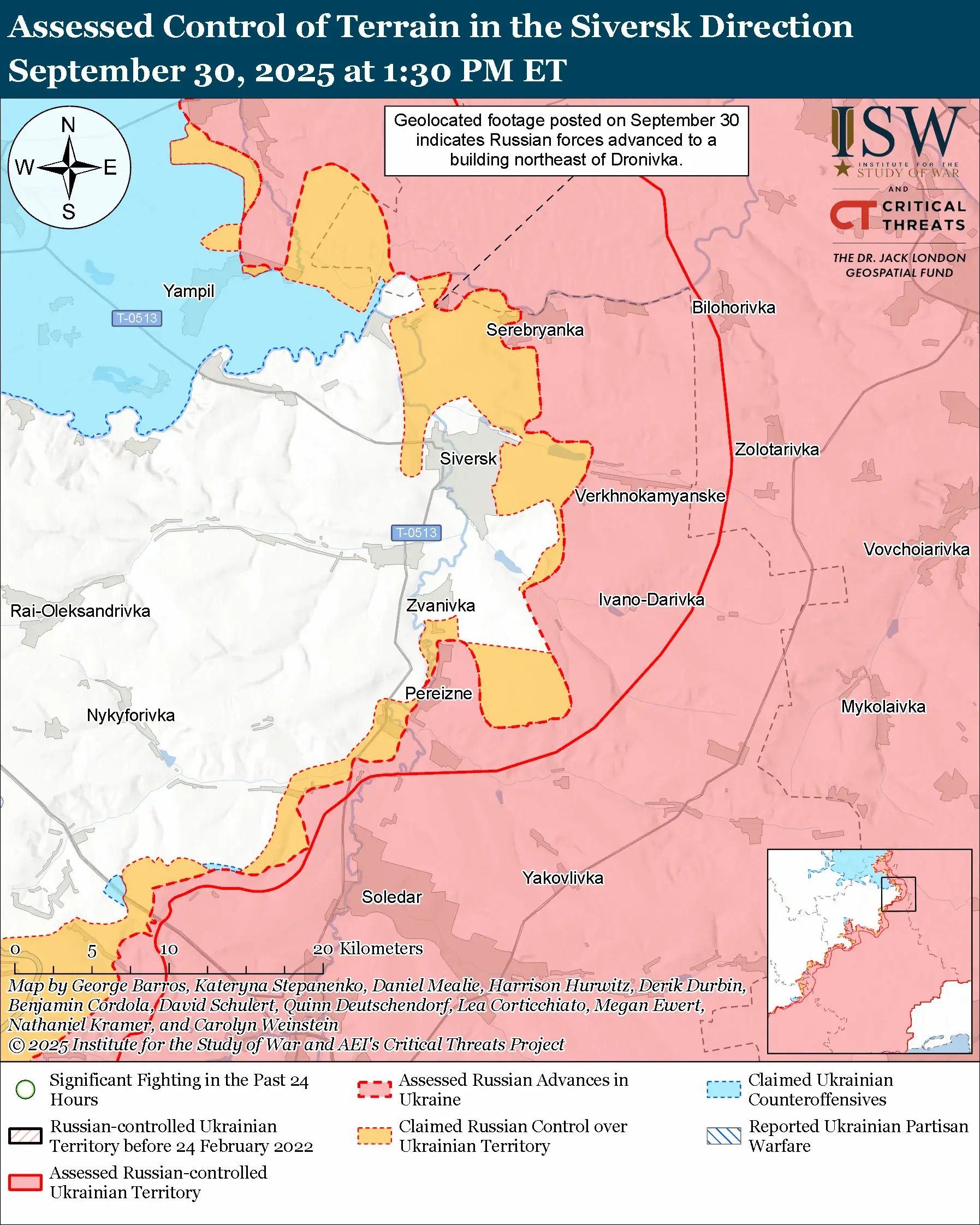 Russian forces made limited advances around Siversk at the end of September. Geolocated footage from September 30 confirmed movement northeast of Dronivka, though earlier Russian claims of progress into southern Zvanivka were disproven by strike footage from September 29. The Russian Ministry of Defense additionally claimed that elements of the 7th Motorized Rifle Brigade captured the small Soviet-era settlement of “Maly Siversk” northeast of Dronivka, though this remains unverified. Milbloggers also suggested advances north of Vyimka and into the southern outskirts of Zvanivka. On September 30, Russian attacks were reported on multiple approaches to Siversk: northwest near Dronivka, northeast near Serebryanka, east near Novoselivka, and southwest near Fedorivka. Meanwhile, drone operators from the Russian 88th Motorized Rifle Brigade have been active against Ukrainian positions in Zvanivka.