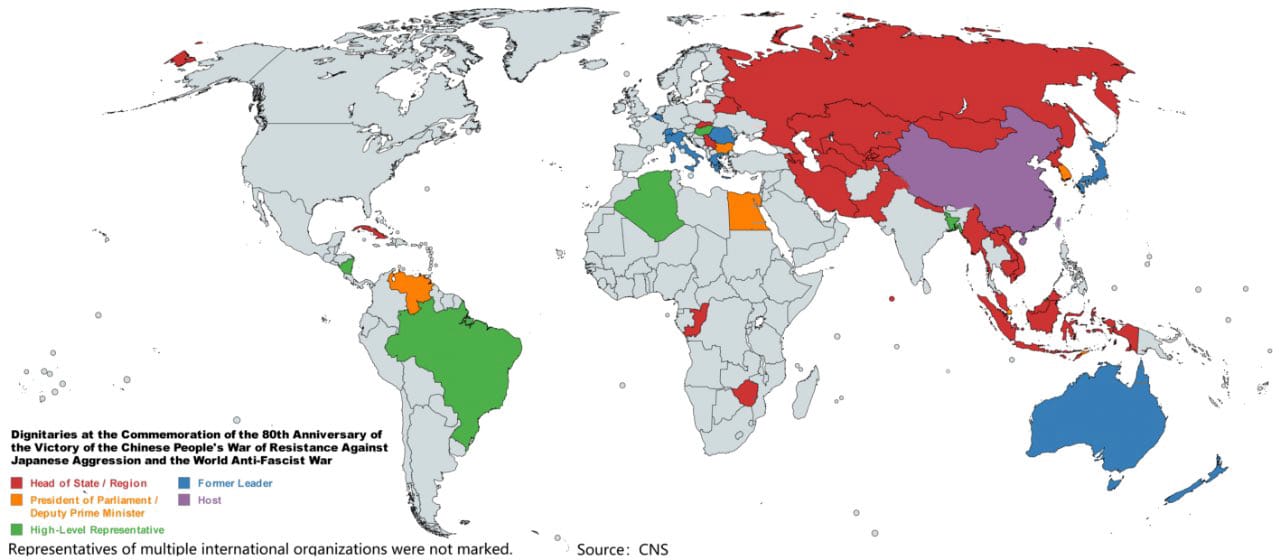 Japan: Tokyo not only declined to attend but reportedly urged other states to skip the parade. Historical disputes over Japan’s wartime role, combined with current tensions over Taiwan and the East China Sea, make Japan’s absence both expected and symbolic.