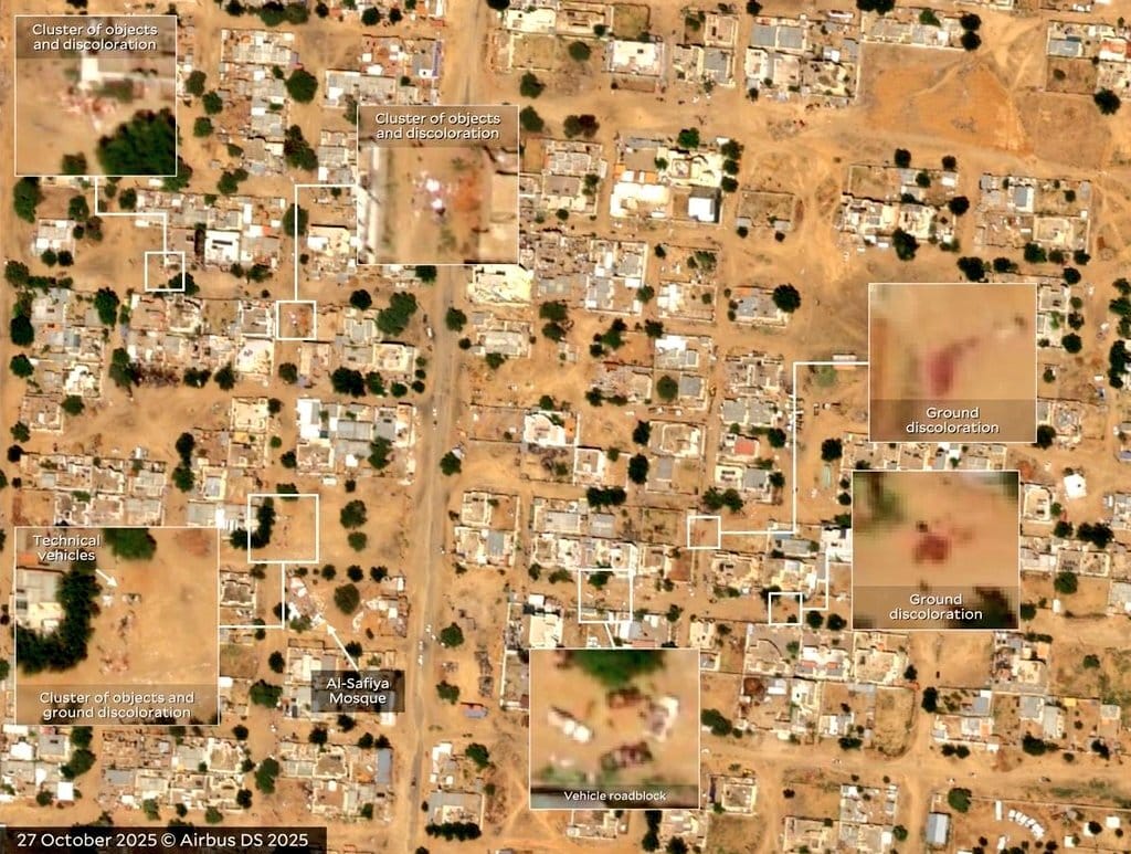 Africa focussed OSINT account AfriMEOSINT believes satellite imagery shows blood from massacre sites in the fallen city of el-Fashir